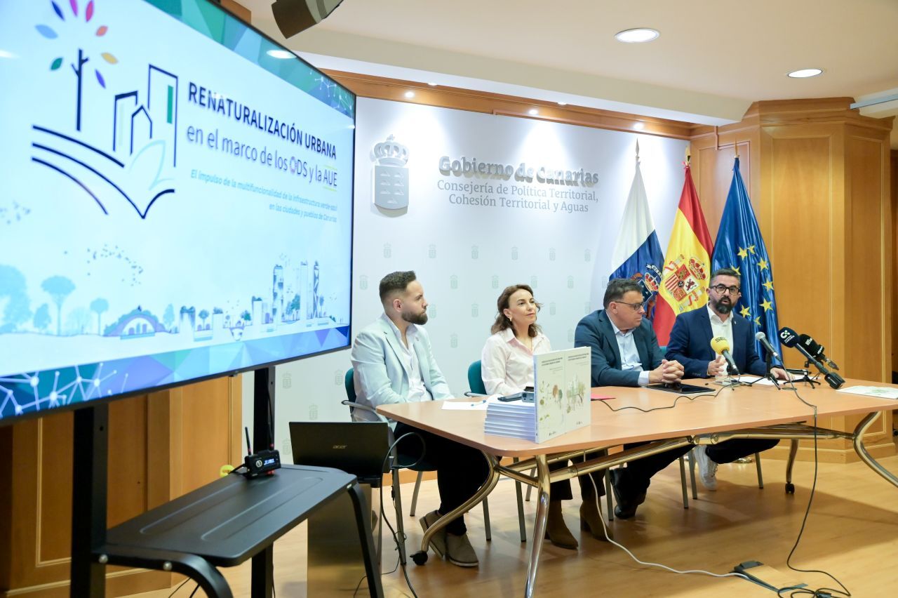 La Consejería de Política Territorial, Cohesión Territorial y Aguas del Gobierno de Canarias presentó este jueves el proyecto de Renaturalización Urbana en el marco de los Objetivos de Desarrollo Sostenible y la Agenda Urbana Española, una iniciativa con la que pone a disposición de ayuntamientos y cabildos cuatro herramientas para incorporar soluciones basadas en la naturaleza en la planificación de ciudades y pueblos del archipiélago.